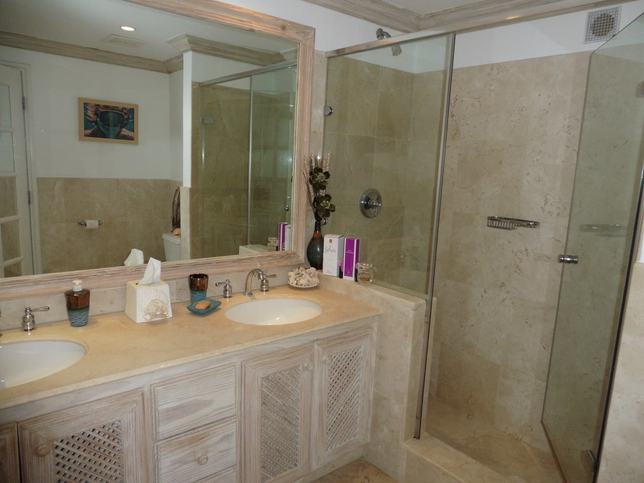 This Beautifully decorated 2 bedroom, 2 bathroom ground floor apartment is located in a private spot with in the stunning Port St. Charles Marina. The apartment has updated stainless steel appliances and refreshed cabinets in the kitchen. The spacious bedrooms have been furnished to a high standard and compliment the cool breezes which fill the apartment. The apartment has a large covered patio where there is an entertaining lounge and dining area. There is also a sundeck and private plunge pool. The patio and deck offer views across the lagoon towards the beach . It is the perfect place to watch the sunset! There is a private dock (30ft) and two parking spaces.